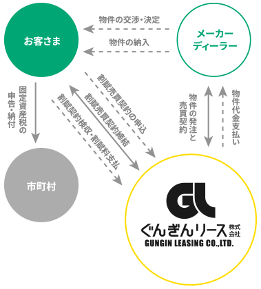 お客さまが必要とされる物件(あらゆる物件が対象となります)を、ぐんぎんリースが代わって購入し、お客さまに長期・分割払いにて販売するシステムです。